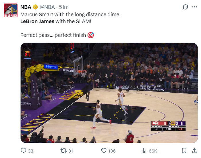 勒布朗原本是不打背靠背第二场的,大概率是因为输给西部垫底的国王触动太大,他在赛前决定继续鏖战,开场他就完成了一个单臂劈扣出一口恶气,而且他首节送出6个助攻,文森特的三个三分都是来自老詹的传球,首节6分2篮板6助攻1盖帽。