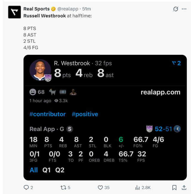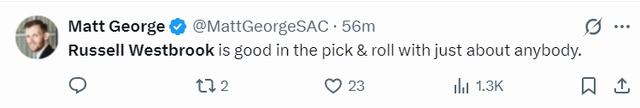国王记者:拉塞尔-威斯布鲁克可以跟任何人挡拆,挡拆配合时他都非常出色。
