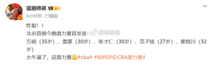 当然,相比于广厦和山西,他们还会派出几个年轻球员,北京队确实更损,他们是全员的老将,这是完全将CBA的潜力赛,当成老年赛在玩。而有了北京队带头后,在接下来的比赛,估计大部分球队也会纷纷效仿,让球队中即将退役的老将出战潜力赛,这样既可以完成篮协和CBA定下来的任务,又可以避免主力球员受伤,确实是一举两得。只不过,篮协这一次确实是被北京队这损招坑惨了。